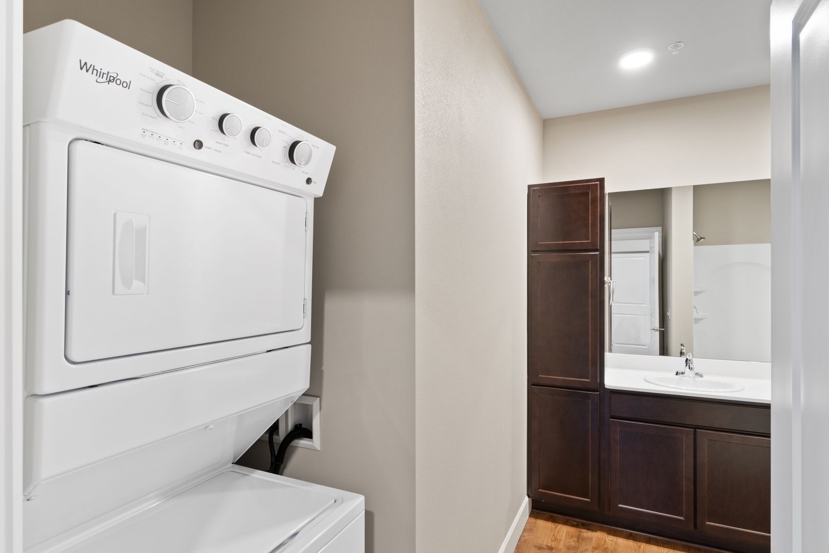 The spacious bathroom features modern finishes and a convenient in-unit washer and dryer. A generously sized closet provides abundant storage, while sleek vinyl plank flooring, stainless steel appliances, and 10-foot ceilings give the space a contemporary flair.